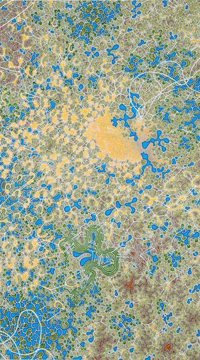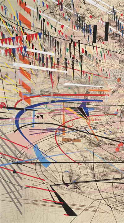 Specializing in work built up upon layers, Mehretu draws her energy from modern city life. Her works are at a large scale and the gestural marks are meant to tell an infinite number of narratives about the grungy cities dotting the planet.